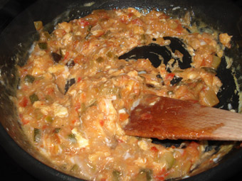En una sartén grande con un par de cucharadas de aceite, rehogamos a fuego suave la cebolla, los pimientos y los calabacines cortados en cuadraditos pequeños. Cuando las verduras estén bien pochadas, añadimos la salsa de tomate. Dejamos que se cocine todo junto unos cinco minutos a fuego suave. Batimos los huevos y los incorporamos a la sartén, removiendo con una espátula de madera (foto 1ª), procurando que el pisto nos quede jugoso. Ponemos a punto de sazonamiento.