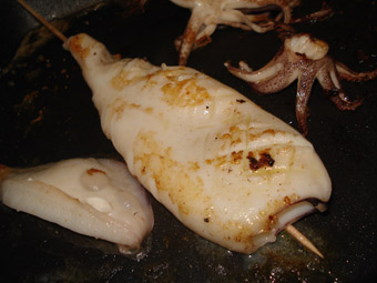A los cuerpos de los calamares, les realizamos unas pequeñas incisiones (sin llegar a cortarlo) en forma de rombo y los pinchamos por los extremos con una brocheta, para que guarden su forma al cocinarlos. Los colocamos, sobre una plancha (o sartén antiadherente) untada con un poco de aceite, a fuego vivo (foto 2ª). Cuando estén ligeramente dorados, les damos la vuelta. Los tendremos aproximadamente, minuto y medio, por cada lado. También colocamos en la plancha los tentáculos y aletas. Cuando estén cocinados, retiramos la brocheta del cuerpo del calamar