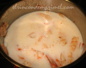 Cocinamos unos minutos, hasta que el calamar cambie de color, y se vuelva opaco. Entonces, incorporamos la harina y la rehogamos para que pierda el sabor a crudo. Añadimos los langostinos picados (foto 4ª) y vertemos la leche caliente infusionada, poco a poco sin dejar de remover para que no se nos hagan grumos.