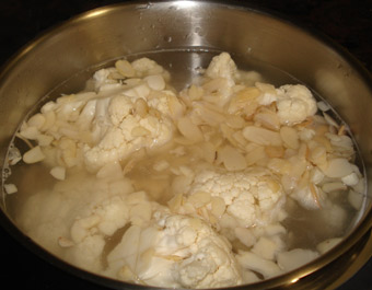Para limpiar la coliflor primero soltamos sus ramilletes. Colocamos éstos en un recipiente grande con abundante agua y una par de cucharadas de vinagre durante 10 minutos, para que se limpien de impurezas. Escurrimos sobre un colador y los pasamos debajo del grifo, para enjuagarlos. Una vez limpios, los introducimos junto con las almendras en una cazuela con agua hirviendo sazonada. Cocemos durante 30 min. con la cazuela tapada. Una vez bien cocida la coliflor, le quitamos el agua de cocción (la reservamos para añadírsela a la crema, en caso de que ésta nos quedase excesivamente espesa). Trituramos y colamos por un colador fino. Añadimos la mantequilla poco a poco y con la turmix a máxima potencia, vamos montando el puré, hasta obtener una crema fina. Sazonamos.