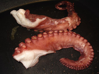 Compramos las patas de pulpo cocidas o las cocemos nosotros (VER COCER). Si los tentáculos son muy gruesos los cortamos transversalmente.