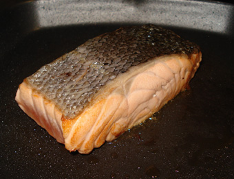 En una plancha o sartén antiadherente, moderadamente caliente, cocinamos el salmón. Para ello, untamos ligeramente los lomos de salmón con aceite de oliva. Los asamos tres minutos por cada lado, primero con la piel hacia arriba, luego por el otro lado y un minuto por los laterales. Los vamos sazonando según les damos la vuelta, para que la sal no penetre en la carne del salmón y produzca la salida de los jugos. Nos tienen que quedar bien dorados por sus caras, pero cruditos en su interior, para que nos quede jugoso (foto 2ª). Si hacemos el salmón en exceso nos resultará seco.