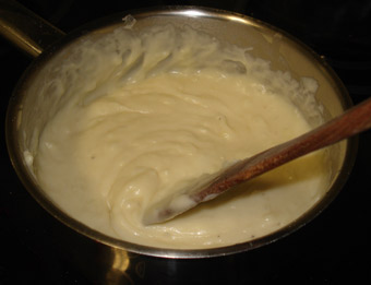 Cocinamos durante al menos 15 minutos a fuego suave, sin dejar de remover (foto 2ª), hasta que desaparezca el sabor de harina cruda y consigamos una bechamel cremosa.