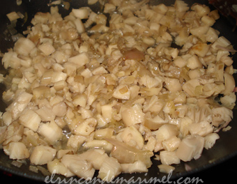 Para elaborar la duxelle de setas, rehogamos en una sartén con un poquito de aceite de oliva, las chalotas junto con el ajo picado. Cuando estén bien pochadas sin que cojan color, incorporamos las setas picadas (foto 1ª) y el pimiento también picado. Dejamos que se cocine hasta que las setas suelten toda su agua, y esta se evapore. |