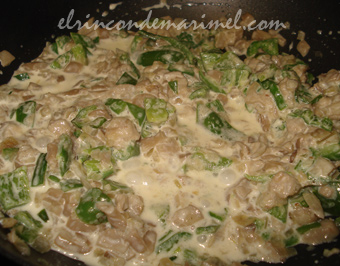 En ese momento añadimos una cucharilla de harina, rehogamos, hasta que pierda el sabor a crudo, y vertemos el vino. Dejamos que éste evapore el alcohol y añadimos la nata (foto 2ª). Dejamos que se cocine hasta que reduzca y quede una farsa compacta. Ponemos a punto de sal y de pimienta. Dejamos enfriar.