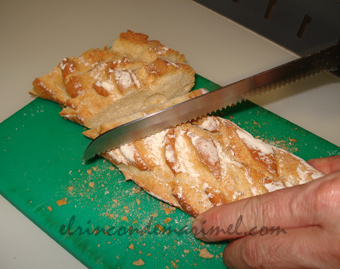 Cortamos el pan sesgado de 1 ó 1,5 cm. de grosor (foto 3ª). Tostamos ligeramente el pan en el horno o en la plancha.