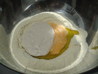 Una vez que ha fermentado, mezclamos en un bol grande el resto de la harina con una cucharilla de sal. Añadimos la manteca reblandecida o en su defecto aceite, un chorrito de vino blanco, un huevo batido, la masa de arranque (foto 1ª) y empezamos a amasar todo con las manos. Vamos incorporando poco a poco, la cantidad necesaria (c.n.) de agua templada, hasta que tengamos una masa elástica, que no se nos pegue en las manos. Tapamos el bol con film o un paño limpio, y dejamos de nuevo reposar hasta que doble su tamaño, al menos una hora.