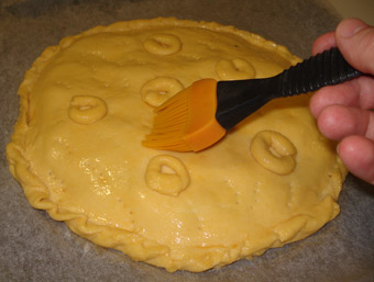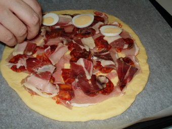 La pinchamos con un tenedor para que no suba en exceso. Sobre la base, teniendo la precaución de dejar un pequeño borde para poder cerrar el hornazo, primero colocamos una capa de lomo fresco, y encima de está, distribuimos el jamón y el chorizo. Después, colocamos los huevos cortados en rodajas (foto 2ª). Por último, cubrimos con la otra mitad de masa, apretamos bien los bordes para unir ambas partes de la masa y trenzamos con los dedos todo el perímetro para que estos queden sellados. Hacemos con los recortes unas figuritas y con ayuda de huevo batido las pegamos a la superficie.