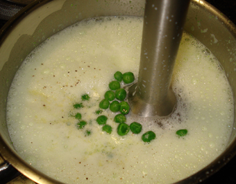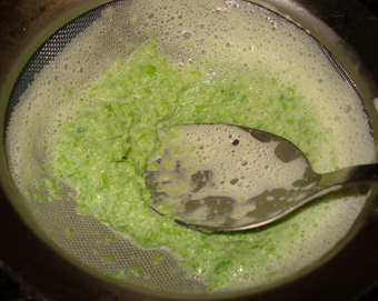 Para elaborar la mamia de guisantes, salteamos en una sartén con un chorrito de aceite, los guisantes durante un par de minutos. Hervimos la leche en un cazo junto con los guisantes salteados (foto 2ª). Una vez que empiece a hervir, apartamos del fuego y trituramos. Colamos (foto 3ª) y ponemos a punto de sal y pimienta.