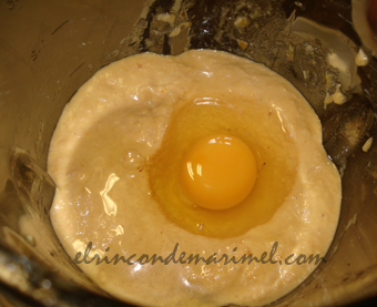 Añadimos uno a uno los huevos (foto 3ª), y seguimos triturando, hasta conseguir una especie de crema. Ponemos a punto de sazonamiento. Luego al cocinarse el pastel queda un poco soso, por lo que el punto de sazonamiento de la masa tiene que ser alto.