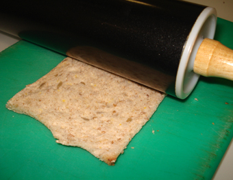 Para las tostadas de pan, cogemos el pan de molde y le quitamos la corteza. Seguidamente lo estiramos con ayuda de un rodillo hasta que reduzca su grosor a la mitad (foto 5ª). Cortamos en dos o en cuatro partes iguales, según el tamaño que le queramos dar a nuestros pintxos. Tostamos sobre una sartén antiadherente.