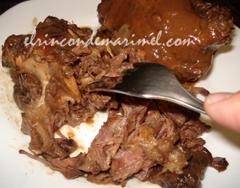 Dejamos cocer hasta que nos quede tierno. Para comprobar el grado de dureza, lo pincharemos con una brocheta. En olla exprés nos tardará en cocer de 45 a 60 minutos. En cazuela normal, procuraremos hacerlo lo más lento posible, y su duración se aproximara a las tres horas. Una vez que tengamos la carne en su punto, sacamos esta de la salsa (foto 2ª). |