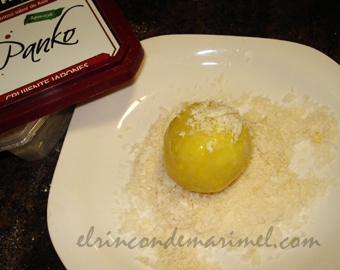 En el momento que las vayamos a freír, colocamos en una sartén alta o un cazo, abundante aceite de oliva y la calentamos. Pasamos las bolas de patata primero por una ligera capa de harina. Para ello nos untamos las palmas de las manos de harina, sacudimos el exceso y frotamos con las manos las bolas. Luego las pasamos por huevo batido y finalmente por panko (foto 6ª). Si no tenemos este pan japonés, que le aporta un punto más crujiente, utilizamos un pan rallado un poco grueso. |
