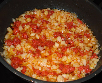 En una sartén con abundante aceite freímos primero a fuego fuerte la patata y la cebolla. Después bajamos el fuego y dejamos que se pochen suavemente removiendo de vez en cuando. En otra sartén freímos la chistorra pelada y picada en trozos pequeños durante unos minutos, para que suelte parte de su grasa. Escurrimos y la incorporamos a la patata (foto 1ª). Cuando la patata esté tierna, sacamos el relleno y lo escurrimos sobre un colador, para que suelte todo el aceite. |