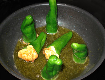 Ponemos una sartén al fuego con un dedo de aceite (utilizaremos el mismo de freír las patatas). Según vamos rellenando con la manga los pimientos (foto 3ª), los colocamos en la sartén de pie, con el relleno hacia abajo, para sellarlos y que éste no se salga (foto 4ª). Pasado un minuto cuando veamos que la boca se ha cuajado, los volcamos en posición horizontal, terminándolos de hacer a fuego suave. Vamos dándoles vueltas hasta que el pimiento se termine de freír.