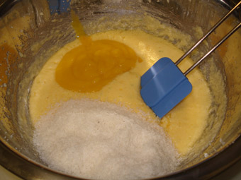 A continuación añadimos el puré de mango y el coco rallado y lo mezclamos con ayuda de una espátula de abajo hacia arriba (foto 2ª). Una vez estén integrados, añadimos la harina tamizada, que previamente habremos mezclado con la levadura y una pizca de sal. Mezclamos ésta, de la misma forma que anteriormente, hasta que quede bien incorporada.Untamos un molde de mantequilla y lo espolvoreamos de harina, quitándole la sobrante. De esta forma haremos una película, para despegar más fácilmente el bizcocho.