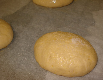 Pasamos este tiempo, vertemos la masa sobre la mesa (foto 1ª), y la amasamos de nuevo para desgasificarla. Le damos forma de rulo, cortamos éste en porciones de unos 60 grs. y hacemos con éstas unas bolas. Vamos colocándolas sobre una bandeja de horno cubierta con papel sulfurizado, bastante separadas unas de otras (porque aumentarán mucho su volumen), y apretamos sus extremos un poco, para darle la típica forma ovalada de un bollo. Volvemos a dejar, que las piezas fermenten y doblen su volumen.