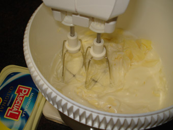 Mientras se enfrían los bollos, elaboramos la crema de mantequilla. Primeramente, hacemos un almíbar con el agua y el azúcar. Dejamos que el agua hierva y se disuelva el azúcar. Retiramos. Con ayuda de una batidora, levantamos las claras a punto de nieve. Para que se monten más fácilmente, las claras han de estar a temperatura ambiente, y el bol muy limpio y preferiblemente de acero inoxidable. Cuando éste casi montada, vamos añadiendo el almíbar caliente en forma de hilo sin dejar de batir, hasta que el merengue esté bien firme y se nos haya enfriado, unos 5 - 8 minutos. Cuando esté listo el merengue, le añadimos poco a poco la mantequilla en pomada y seguimos batiendo hasta que nos quede una crema esponjosa (foto 3ª).