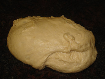 En primer lugar elaboraremos una masa de arranque, para ello, mezclamos en un bol la cuarta parte de la harina, 15 grs. de la levadura y la mitad de la leche templada. Hacemos a la masa un par cortes profundos con un cuchillo en forma de cruz, tapamos con un paño y la dejamos reposar en un sitio templado, hasta que doble su volumen.