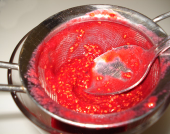 Por otra parte, trituramos las frambuesas y pasamos su puré por un colador para quitarle las pepitas (foto 2ª). Calentamos una cuarta parte y le añadimos el azúcar para que se disuelva. Añadimos las hojas de gelatina previamente remojadas en agua fría y escurridas.
