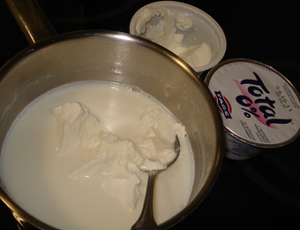 Calentamos la leche y disolvemos en ella el azúcar y la gelatina previamente remojada en agua fría y escurrida. Cuando estén bien disueltas, apartamos del fuego, incorporamos el yogur y mezclamos (foto 1ª). Pasamos por un colador e introducimos en un sifón con una carga de gas. Metemos en la nevera al menos dos horas, pero mejor hasta el día siguiente.