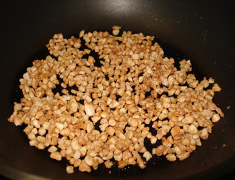 Por otra parte, colocamos una sartén al fuego con dos cucharadas de azúcar y unas gotas de agua. Cuando empiece a licuarse, añadimos las almendras y con una cuchara de madera les vamos dando vueltas sin parar, hasta que el caramelo se adhiera a ellas. (foto 3ª). Nos tienen que quedar sueltas, con un tono acaramelado. |