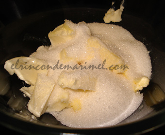 En primer lugar, batimos en un bol la mantequilla en pomada (la sacaremos unas horas antes de la nevera), con el azúcar (foto 1ª). Una vez obtenida una crema añadimos el queso y los huevos, y seguimos batiendo.