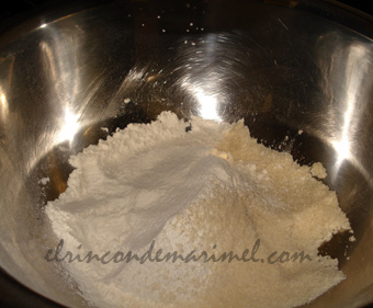 En otro recipiente mezclamos los elementos sólidos, la harina y la almendra molida (las dos tamizadas, pasadas por un colador), una pizca de sal, la levadura y el café soluble (foto 2ª).