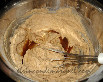 Mezclamos las dos preparaciones e incorporamos el café líquido hasta que quede totalmente integrado (foto 3ª) y obtengamos una masa homogénea. |