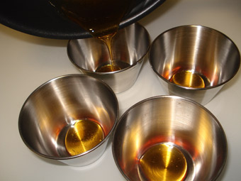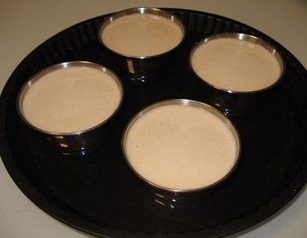 Vertemos la mezcla sobre las flaneras caramelizadas y las colocamos sobre una bandeja con dos dedos de agua (baño María) (foto 3ª). Metemos al horno precalentado a 160º, durante 20 ó 30 minutos, hasta que se cuaje (lo comprobamos, introduciendo una brocheta. Ésta deberá salir seca). |