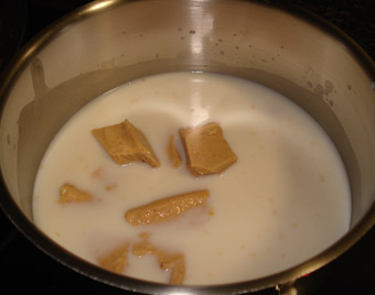Por otra parte, calentamos suavemente en un cazo la leche y deshacemos en ella el turrón (foto 2ª). Podemos ayudarnos de una batidora, triturándolo. Cuando esté el turrón bien integrado en la leche, dejamos enfriar. Una vez esté a temperatura ambiente, lo mezclamos con los huevos batidos y la nata. Si nos gustan los postres muy dulzones, le añadimos un par de cucharaditas de azúcar. |