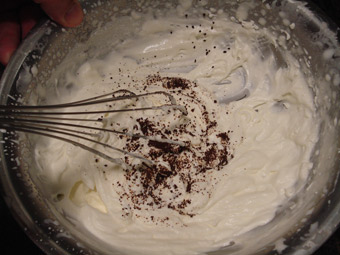 Para el chantilly, montamos la nata, con una varilla. Cuando ésta empiece a espesar, le añadimos el azúcar, el sobre de café y seguimos batiendo (foto 4ª). Para montar la nata, tanto ésta como los utensilios que utilizamos para montarla han de estar muy fríos.