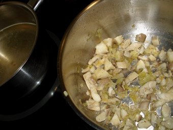 Lo primero será preparar la cebolleta y poner a calentar el caldo. Para que la cebolleta, no se note al comer, hay que hacerla bien, una media hora a fuego muy lento. Aunque un buen truco, es hacerla en el microondas: la picamos finamente, la ponemos un poco de sal y un buen chorro de aceite de oliva, tapamos con papel film y la metemos en el microondas unos 6-8 minutos al máximo. Controlando, que no cojan color. Una vez esté bien ablandada, la colocamos en una cazuela, añadimos las setas y las rehogamos hasta que evaporen todo el agua que sueltan (foto 1ª). Incorporamos el arroz y mezclamos bien. Añadimos el vino blanco con igual cantidad de caldo y subimos el fuego hasta llevarlo a ebullición. Dejamos reducir para que se vaya el alcohol, hasta que se evapore todo el líquido.
