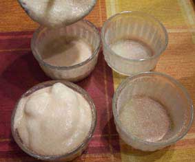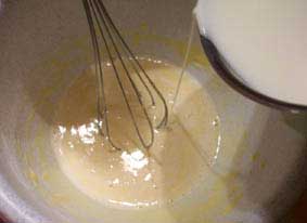 Para la crema, batimos las yemas de huevo con el azúcar. Añadimos la harina tamizada (pasada por un colador) y mezclamos con una espátula hasta obtener una pasta de consistencia ligera. Dejamos la masa reposar durante una hora. Calentamos la leche y la diluimos, poco a poco en la mezcla anterior (foto 1ª).