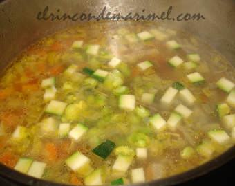 Ponemos una cazuela al fuego con un poco de aceite y rehogamos en ella las cebolletas, los ajos y el puerro picado. Dejamos que se nos poche, pero que no coja color. A continuación añadimos el resto de las verduras, excepto la piel del calabacín y las habas (foto 3ª). |