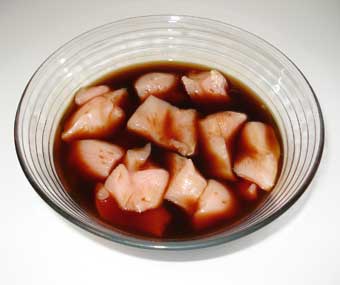 Cortamos el pollo en cubos grandes y los ponemos en un bol . Pinchamos con un palillo los trozos ( para que la salsa penetre mejor) y vertemos encima la salsa (foto 1ª). Maceramos en la nevera, tapado con film, como mínimo una hora. Mientras, ponemos a remojo las brochetas para que absorban humedad y no se nos quemen. Limpiamos los champiñones y les cortamos el tallo, reservando éstos para otras preparaciones