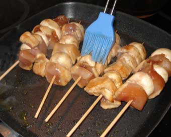 Transcurrida la hora, ensartamos los tacos de pollo y los champiñones, en los pinchos de bambú remojados, alternando ambos. Procuramos ponerlos de la misma anchura en cada brocheta, para que se asen mejor. Con un brochita le ponemos aceite a los pinchos y los asamos en la parrilla o en una plancha a calor mediano, 5 minutos por cada lado. Untamos frecuentemente con una brocha la salsa glasé cuando se estén asando, (foto 2ª) y una vez más, antes de servir.